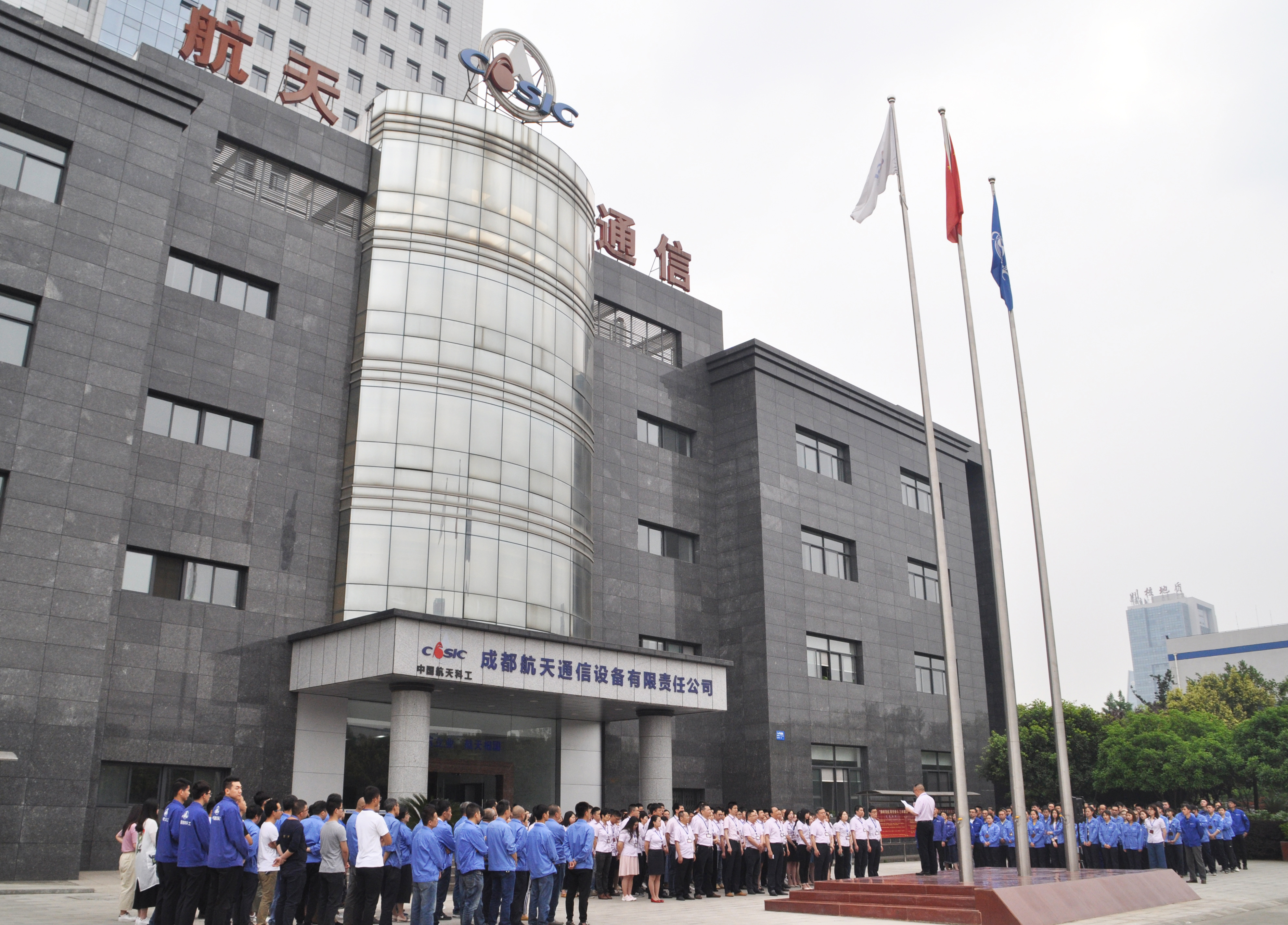 成都航天围绕“逐梦航天 合作共赢”主题举行升旗仪式。公司领导班子、中层干部、团员青年、职能部门全体人员以及部分事业部、制造部员工约300人英姿飒爽,整齐列队。在激昂的国歌声中,五星红旗冉冉升起,在雄壮有力的《航天科工之歌》中,蓝、白色的集团公司司旗随风舞动,彰显了我国航天事业的蒸蒸日上。