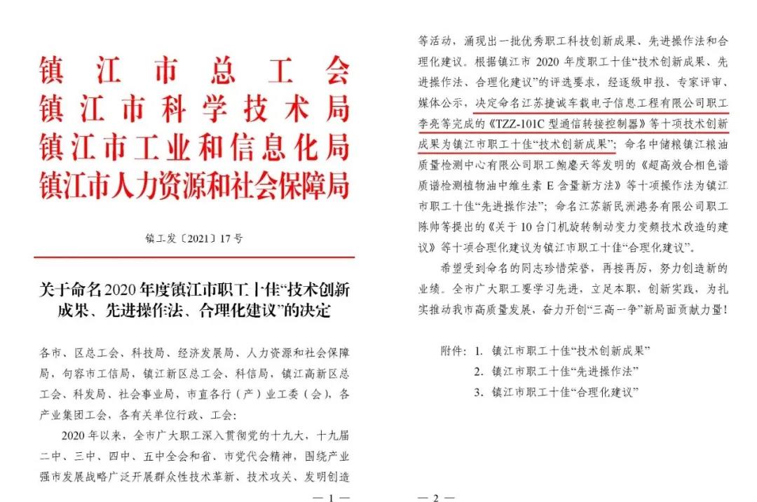 近日,该技术创新项目被镇江市总工会、科学技术局、工业和信息化局与人力资源和社会保障局于授予镇江市职工十佳“技术创新成果”奖。研发团队表示:后续将珍惜荣誉、再接再厉,大力弘扬航天精神,同时要充分发挥引领和传、帮、带、教等作用,将个人的先进经验转化为群体的技能优势,把在科研开发中遇到和解决的技术难题进行总结、研究,更好地发挥示范带头作用,为企业高发展作出更大贡献!