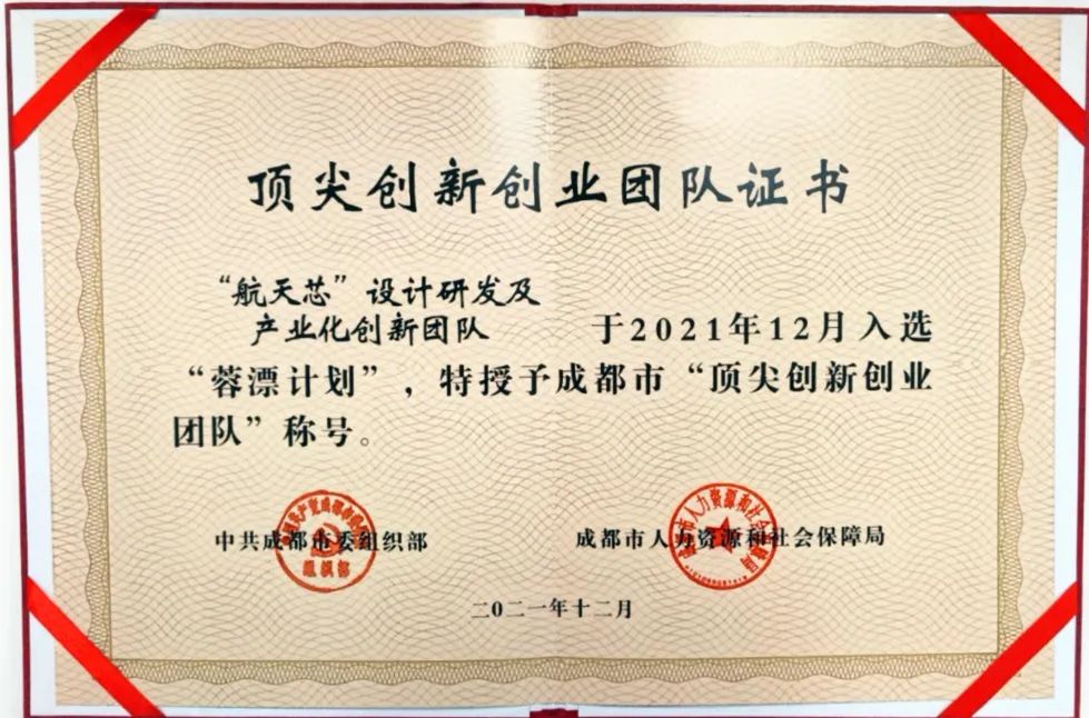 4月28日,2021年成都市“蓉漂计划”入选专家和团队发证仪式在成都人才综合服务中心举行。通信研究院“‘航天芯’设计研发及产业化创新团队”获成都市“顶尖创新创业团队”称号,并获得500万元人才奖励。