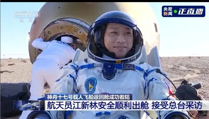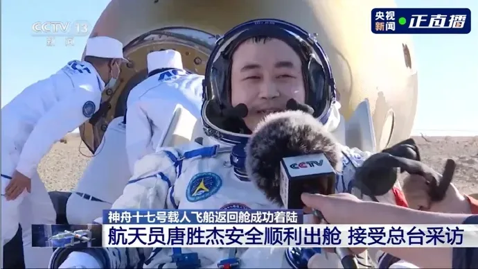 北京时间2024年4月30日17时46分,神舟十七号载人飞船返回舱在东风着陆场成功着陆,现场医监医保人员确认航天员汤洪波、唐胜杰、江新林身体状态良好,神舟十七号载人飞行任务取得圆满成功。