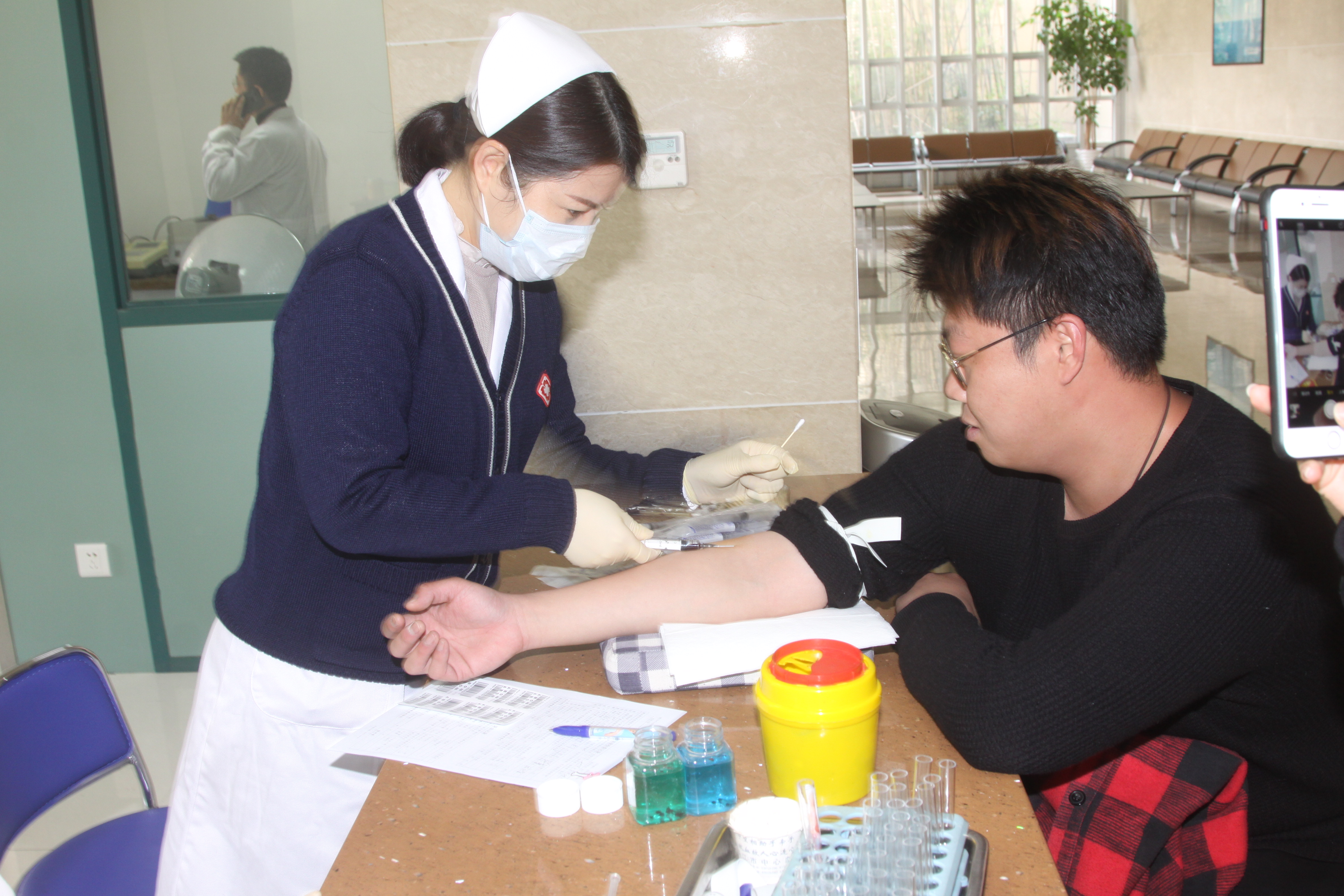 在血液中心工作人员的指导下,捷诚职工排着长队测量血压、抽血化验,有条不紊的进行着血液检验。