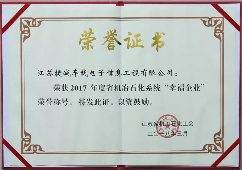 近日,航天通信江苏捷诚公司荣获2017年度江苏省机冶石化系统“幸福企业”荣誉称号。