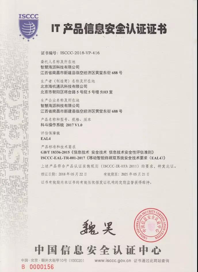 经过多方历时半年的共同努力,智慧海派科技有限公司送检的科斗操作系统(Tadpole OS 2017/V1.0)通过了信息产业信息安全测评中心有关移动智能终端双系统的EAL4级认证检测,于2018年6月份顺利获得了中国网络安全审查技术与认证中心(原中国信息安全认证中心)的EAL4级的信息安全认证证书,这是中国网络安全审查技术与认证中心针对非智能卡类IT产品颁发的首张EAL高级别信息安全认证证书。
