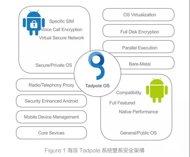 基于系统虚拟化技术,在单一核心下执行两个完整的Android系统。每一个Android系统皆具备完整的执行功能并且兼容于第三方软件。两个Android系统互不依赖,完全独立。当Tadpole系统启动后,可视需求或环境状况只启动任一系统,也可以据实际状况完全关闭任一系统。例如在极机密环境中,公开日常系统 (Public/General OS) 就完全关闭,而不仅是隐藏在背景执行。