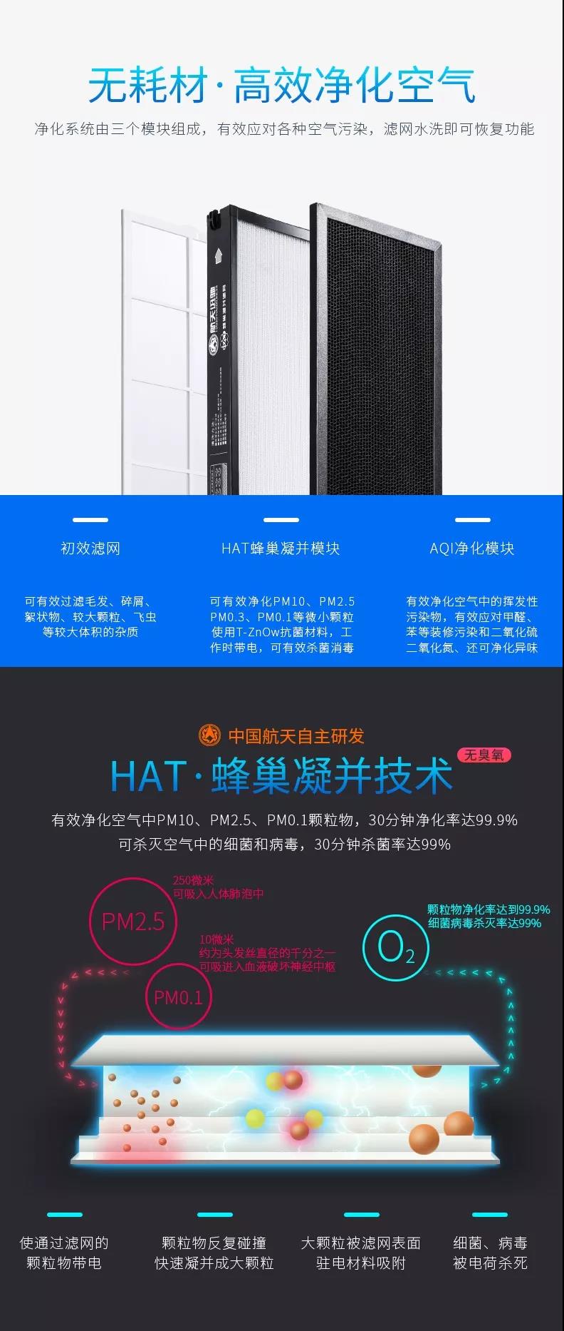 航天迅驰空气净化器为无耗材空气净化器,净化效能超2016新国标3倍;CARD值(每小时净化空气量)335立方米/每小时(大);运用中国航天自主研发 HAT·蜂巢凝并技术,有效净化空气中PM10、PM2.5、PM0.1颗粒物,30分钟净化率达99.9% 可杀灭空气中的细菌和病毒,30分钟杀菌率99%。