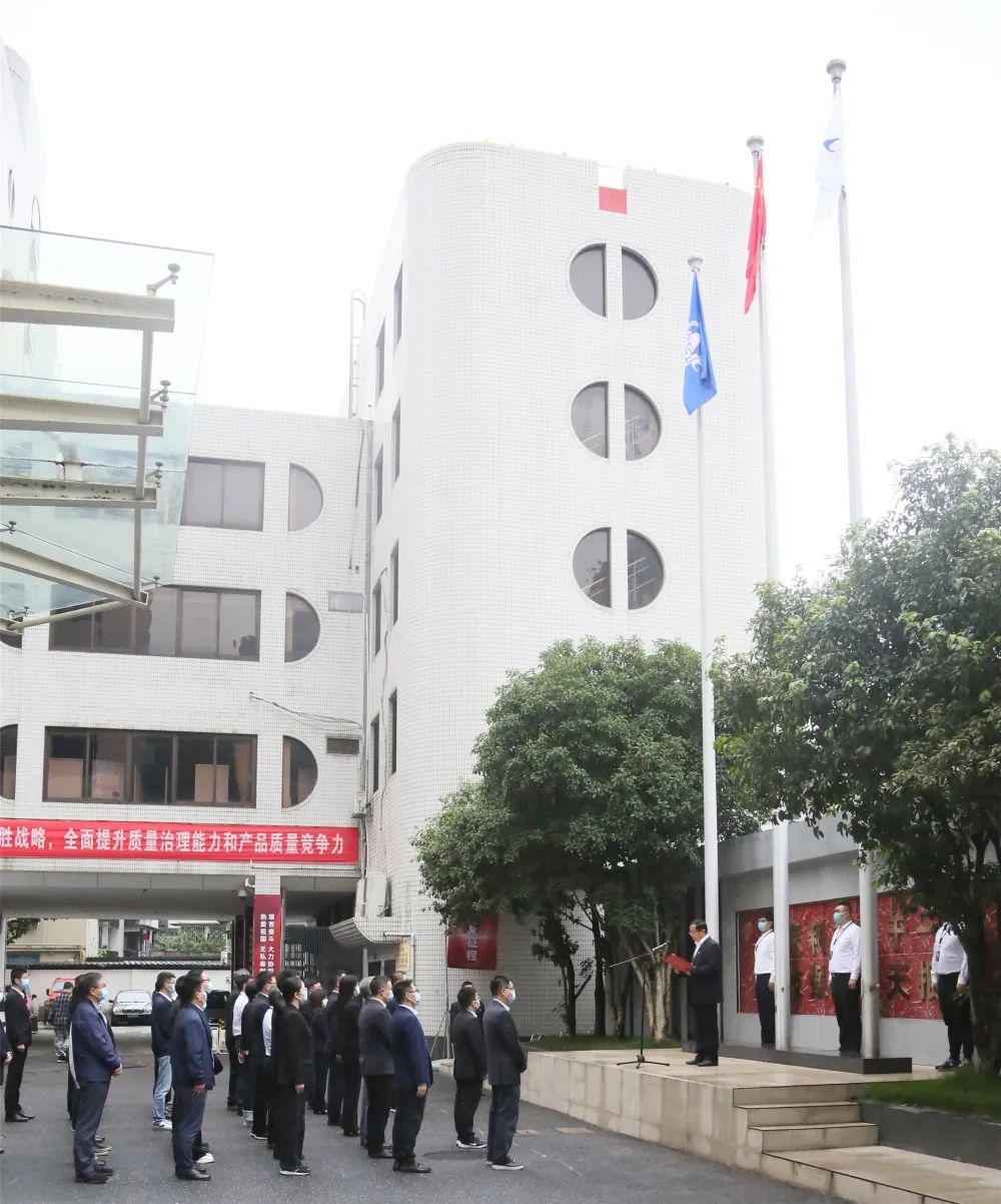 伴随着雄壮的国歌,鲜艳的五星红旗冉冉升起,随着激昂的航天科工之歌,集团公司司旗飘扬空中。参加升旗仪式的全体干部职工庄严肃立,行注目礼。