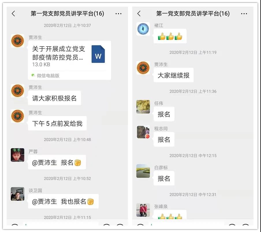 江苏捷诚第一党支部由人事政工部和行政保卫部两个部门组成,共有党员12名。正值春节假期,党支部书记贾沛生在党员群里发布了一条动员信息:“公司党委为了更好地应对疫情防控工作,要成立一支党员疫情防控突击队,希望大家踊跃报名”。随即,手机的提示音“滴滴”地响个不停,报名加入的消息不间断的回复。在急难险重的任务面前,支部党员同志们选择义无反顾地投身到抗击疫情工作中,全力支持企业疫情防控大局。