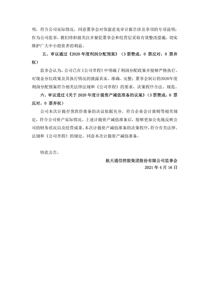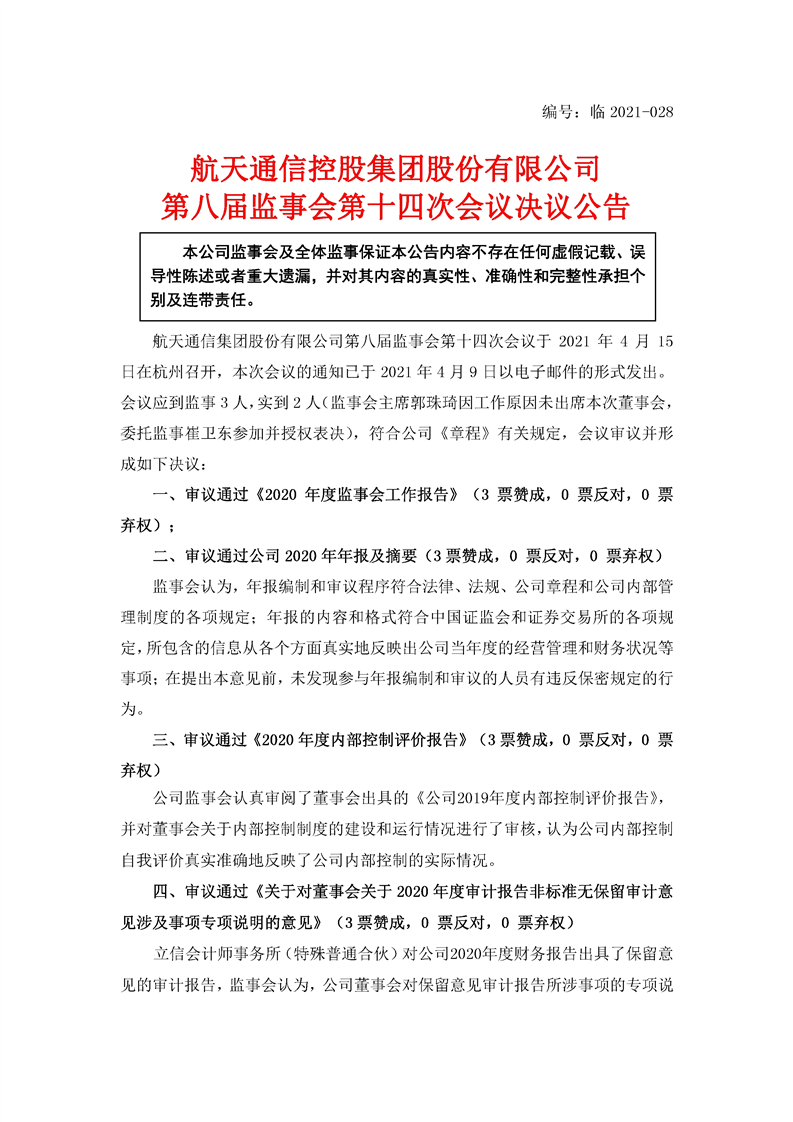 航天通信控股集团股份有限公司八届十四次监事会决议公告