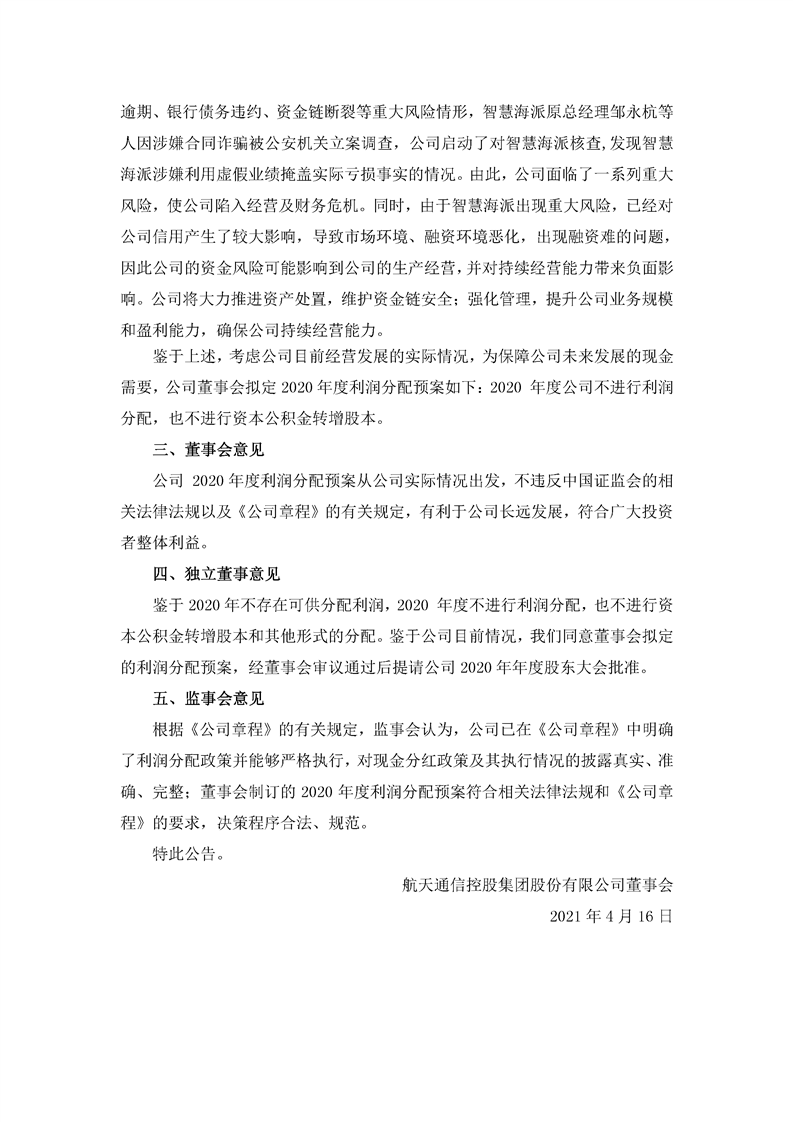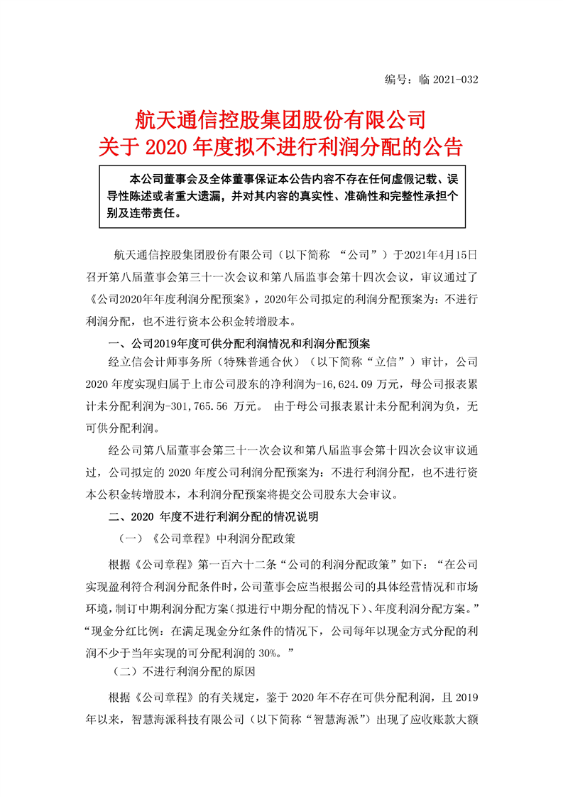 航天通信控股集团股份有限公司关于2020年度拟不进行利润分配的公告