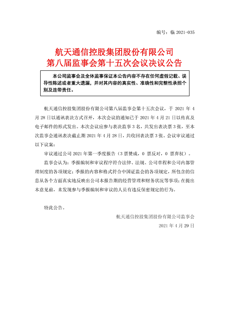 航天通信控股集团股份有限公司八届十五次监事会决议公告