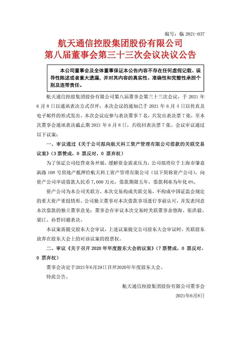 航天通信控股集团股份有限公司八届三十三次董事会决议公告