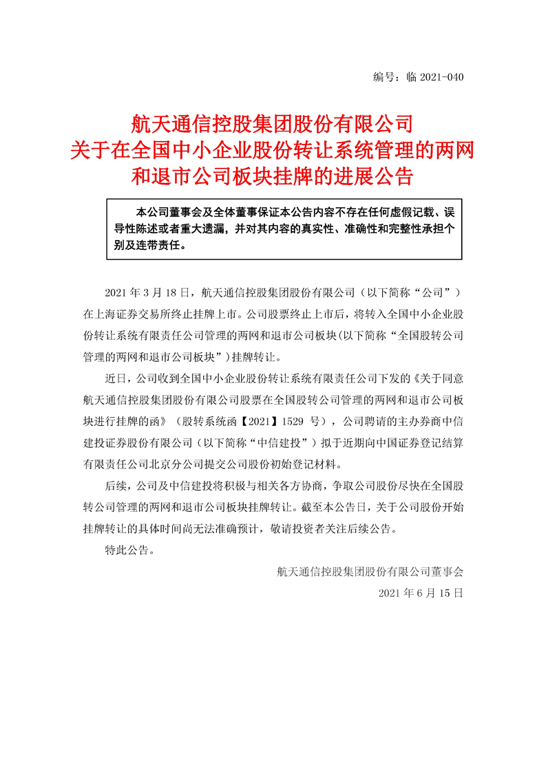 航天通信控股集团股份有限公司关于在全国中小企业股份转让系统管理的两网和退市公司板块挂牌的进展公告