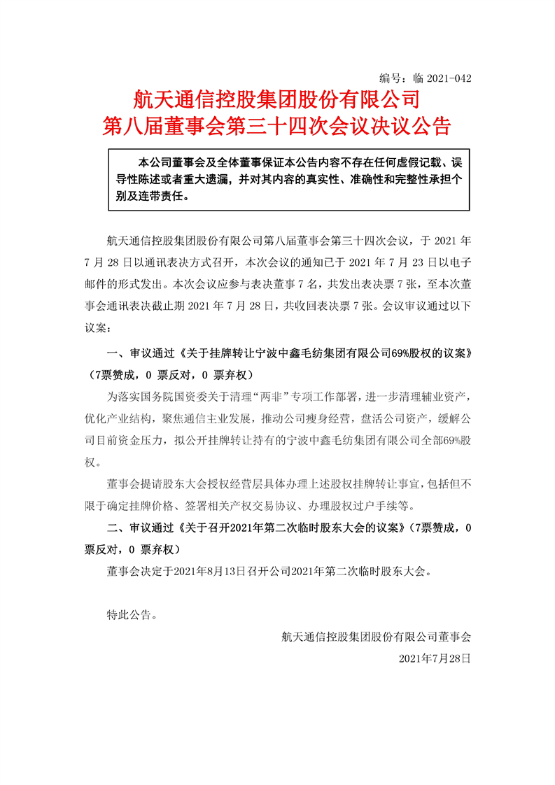 航天通信控股集团股份有限公司八届三十四次董事会决议公告