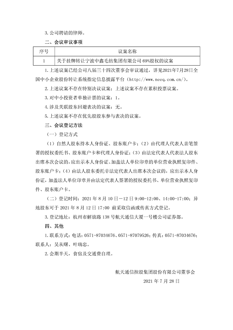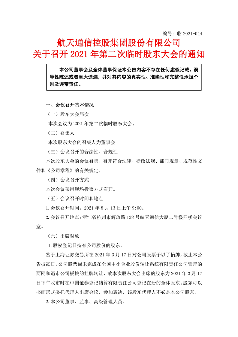 航天通信控股集团股份有限公司关于召开2021年第二次临时股东大会的通知