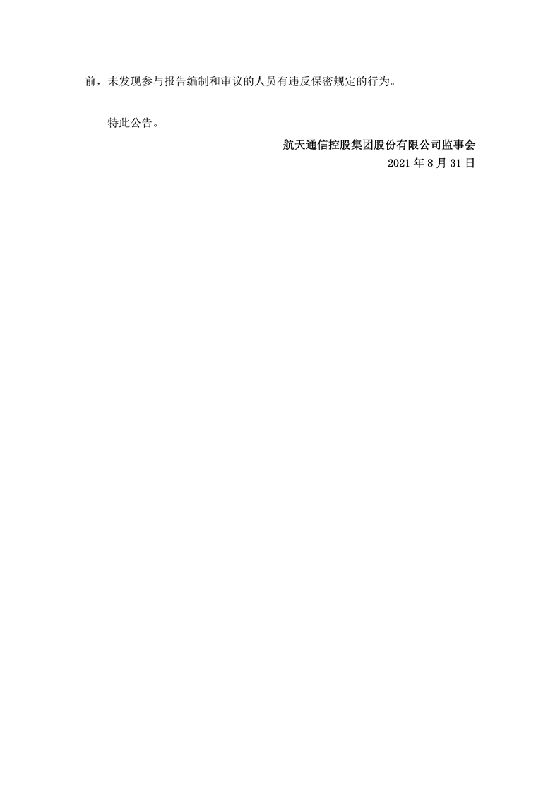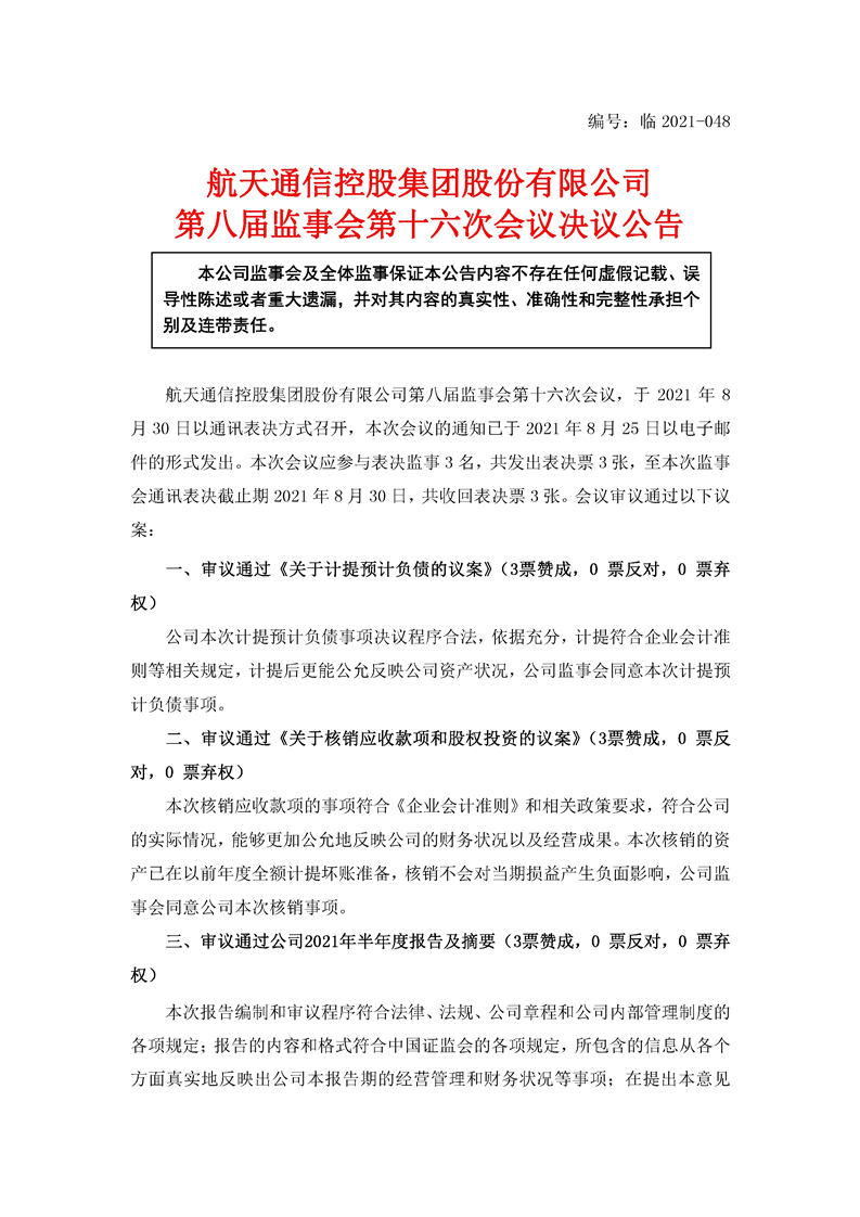 航天通信控股集团股份有限公司八届十六次监事会决议公告