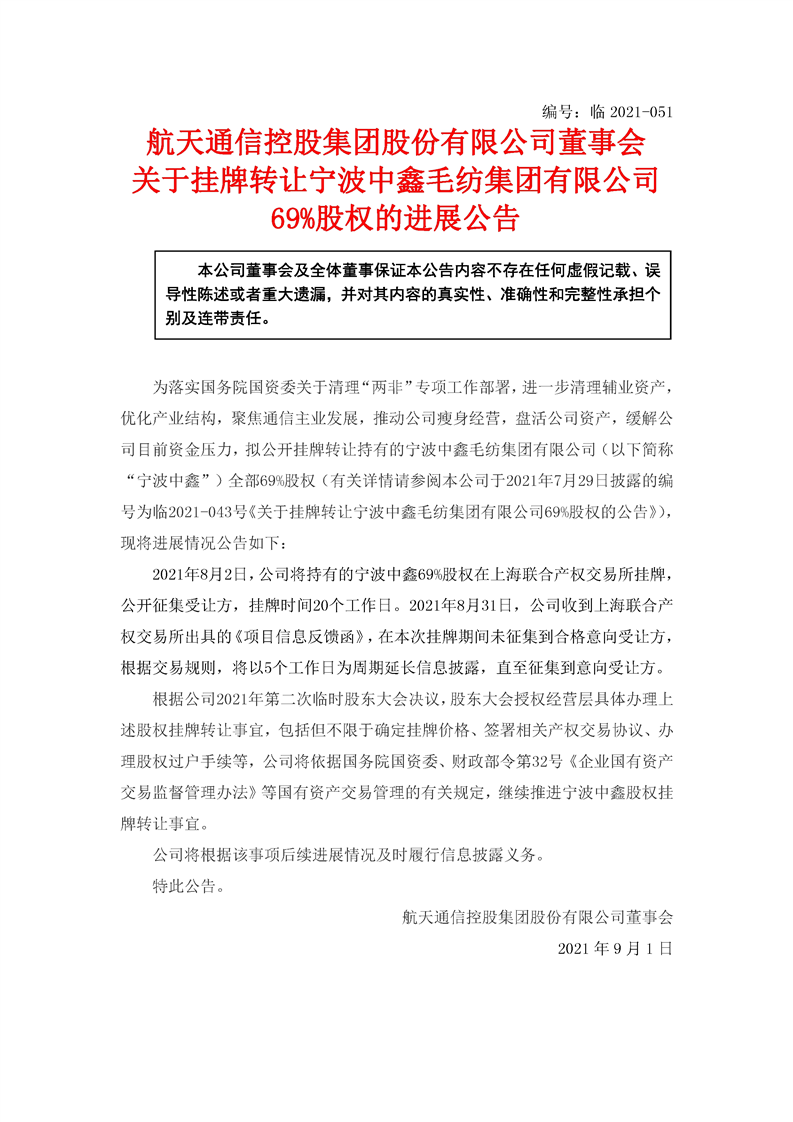 航天通信控股集团股份有限公司关于挂牌转让宁波中鑫毛纺集团有限公司69%股权的进展公告