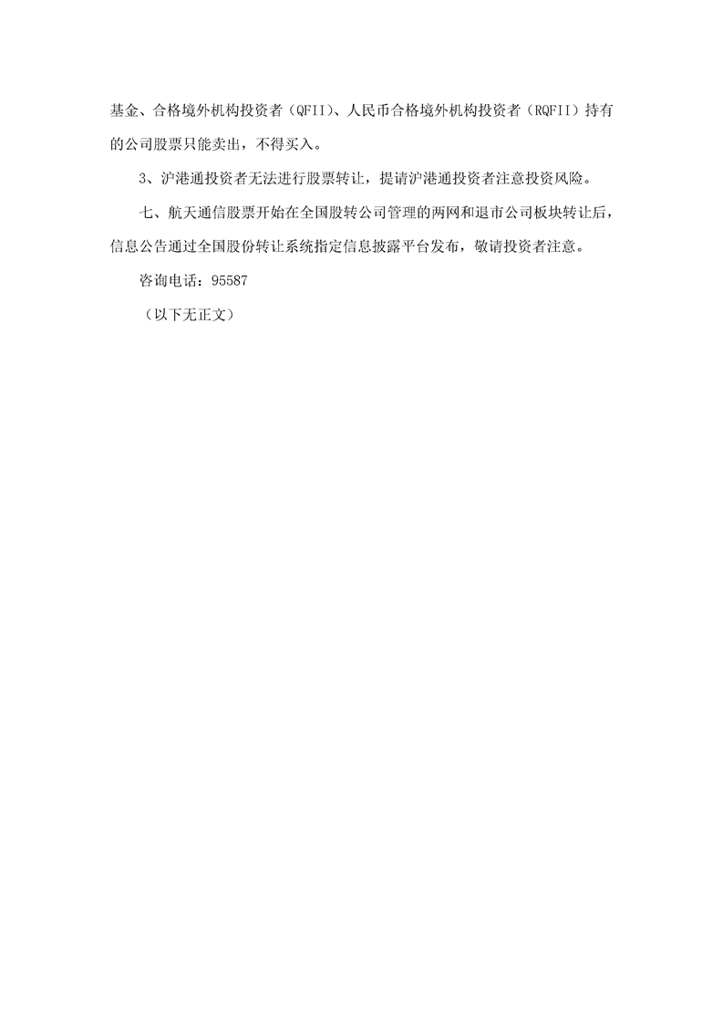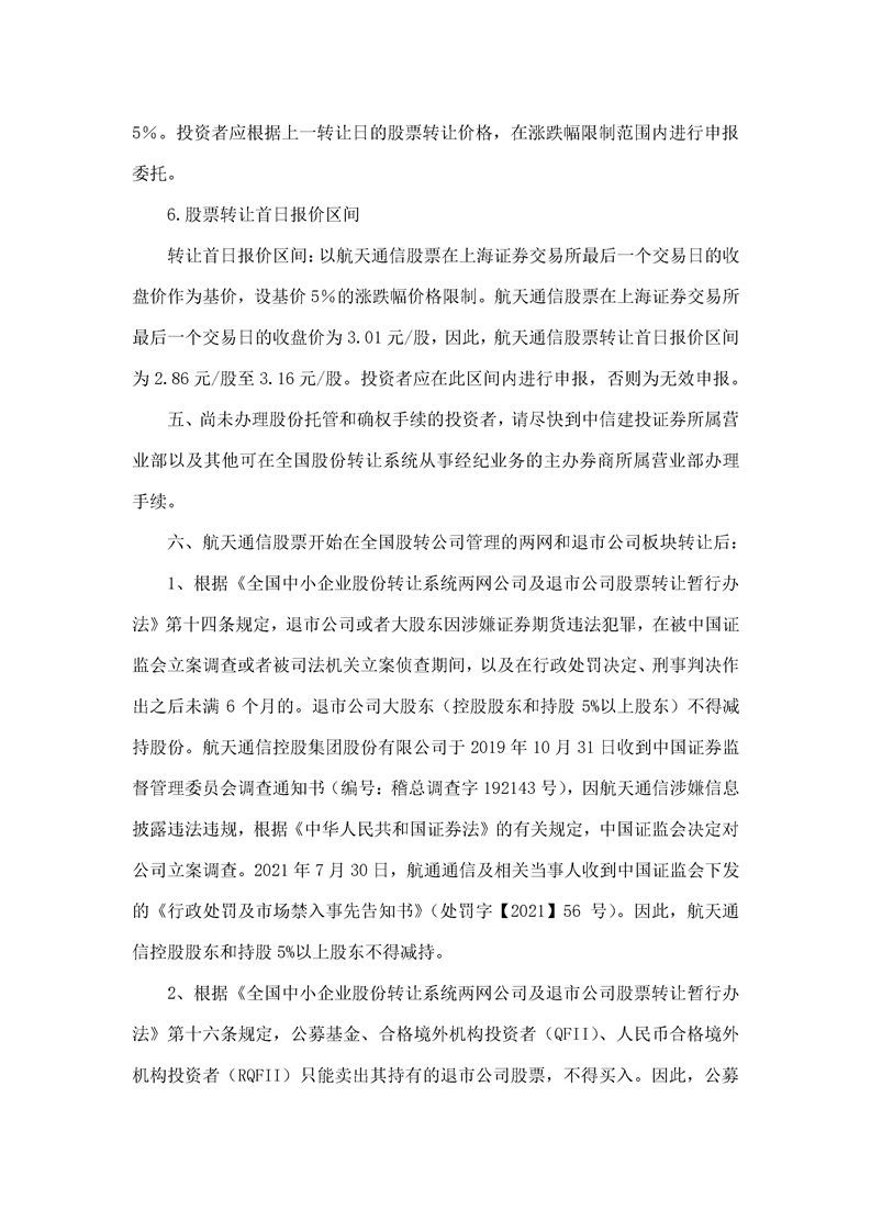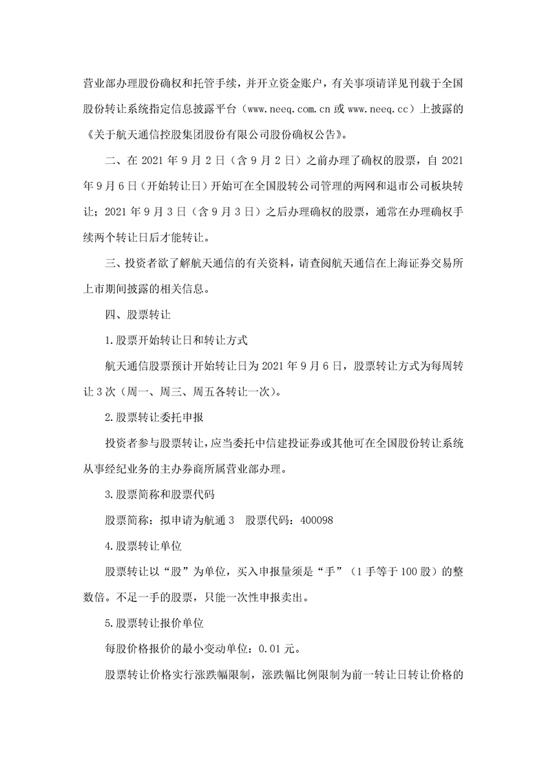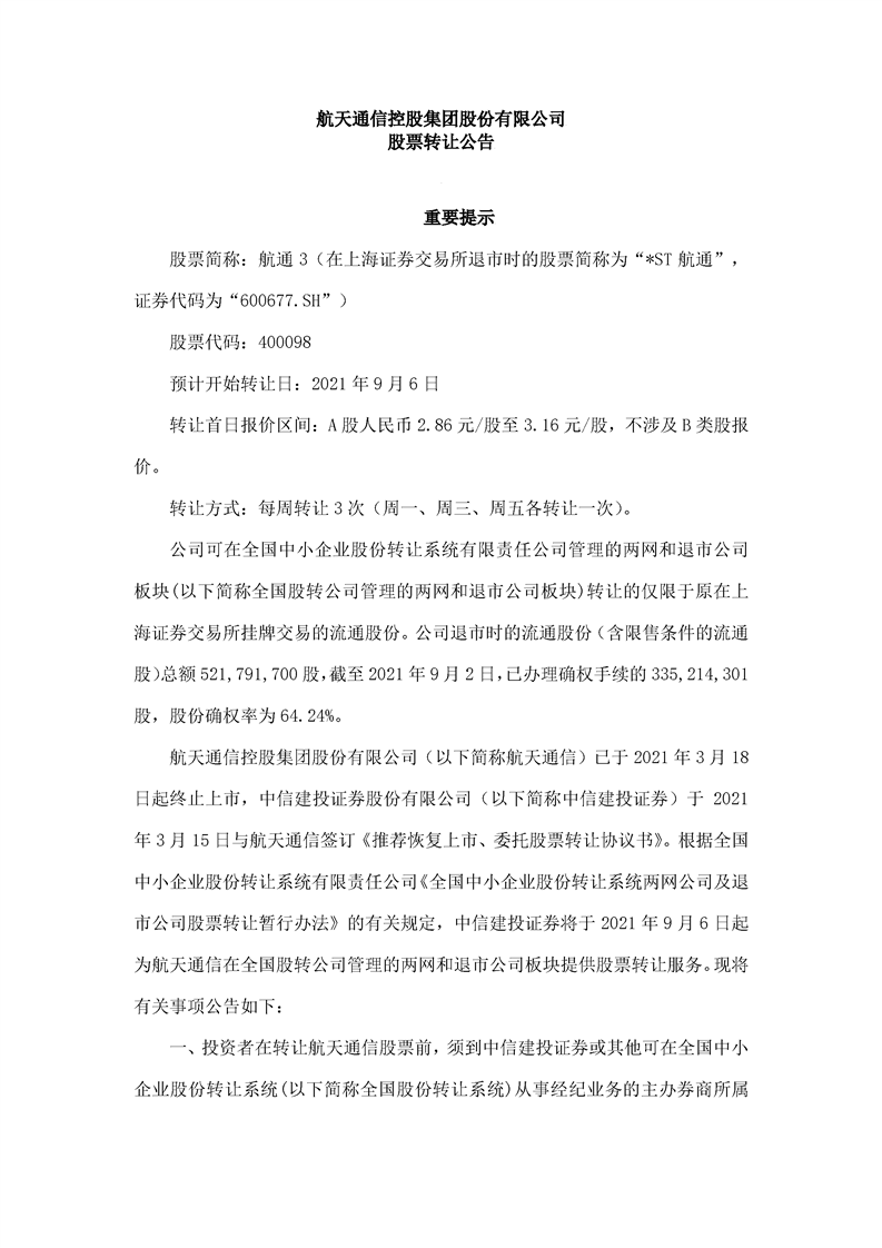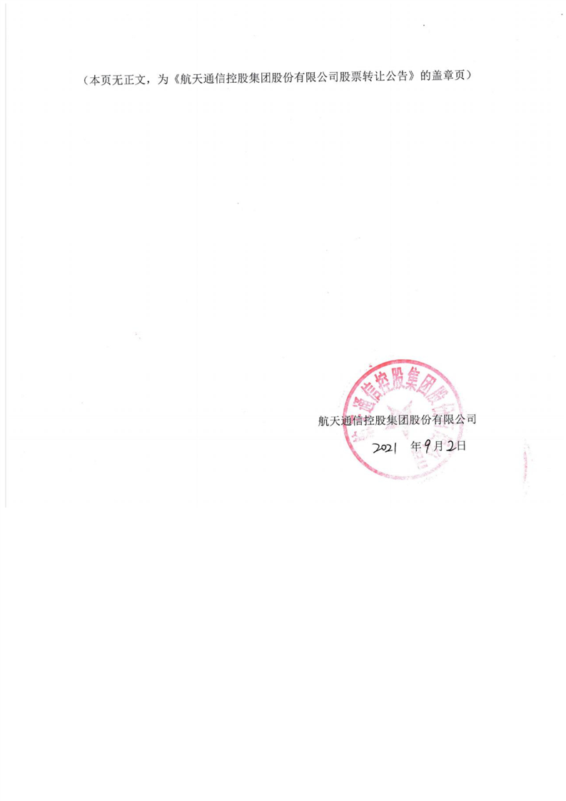 航天通信控股集团股份有限公司股票转让公告