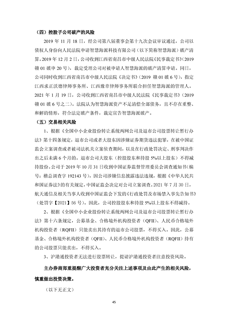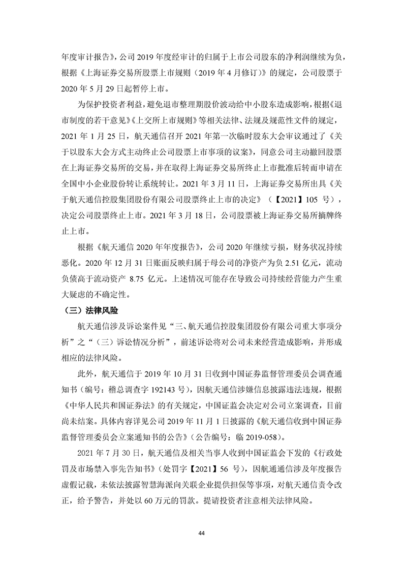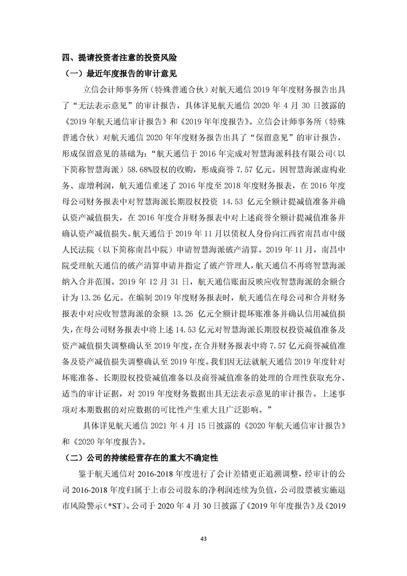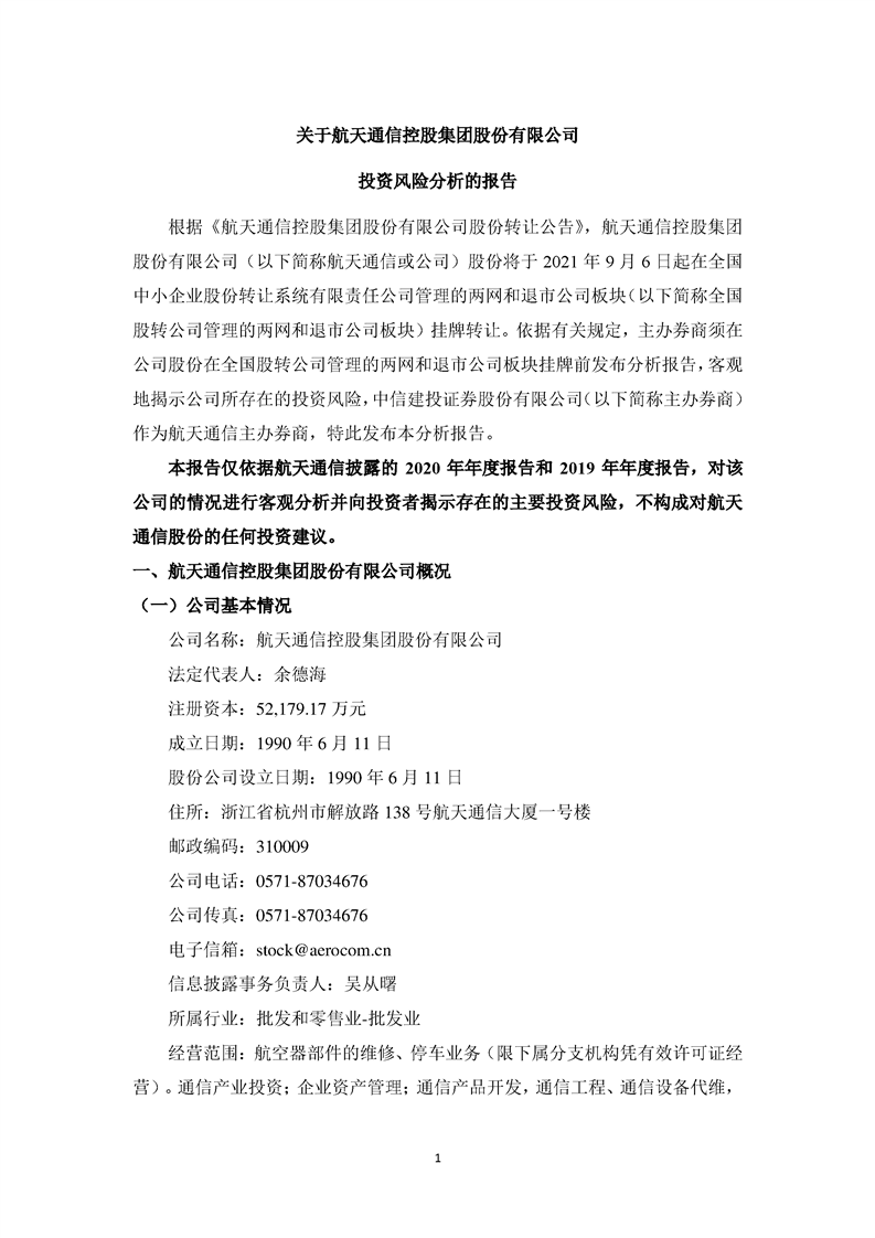 关于航天通信控股集团股份有限公司投资风险分析的报告